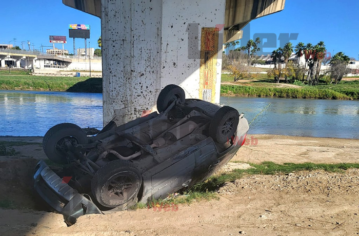 NUEVO LAREDO, TAM.- Una camioneta quedó abandonada a orillas del río Bravo después de que la persona que conducía perdiera el control y se volcara.
