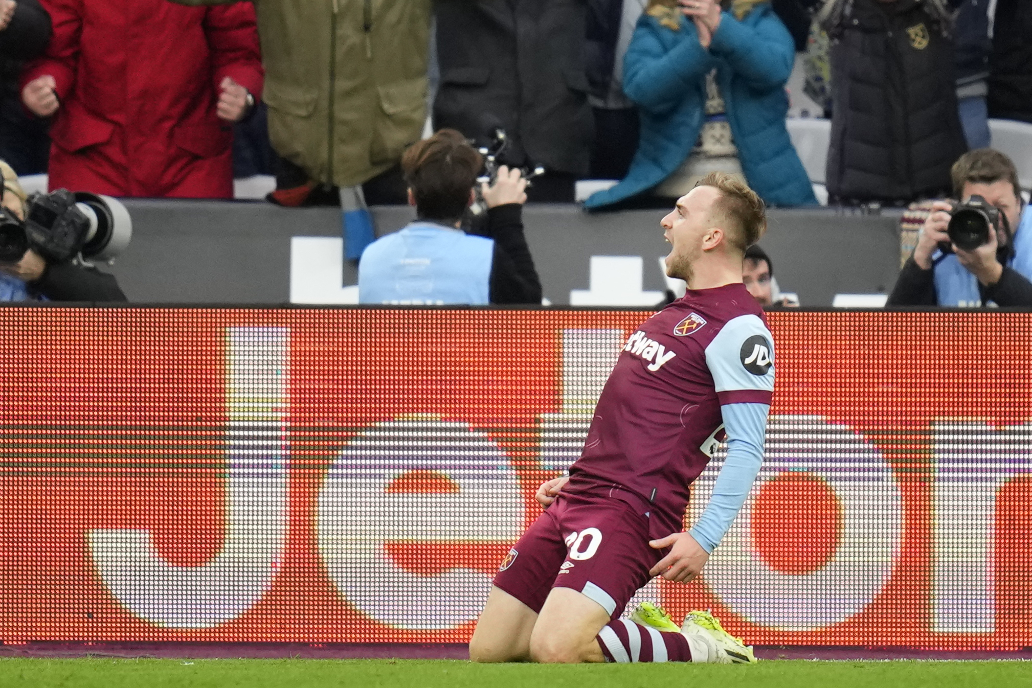 Jarrod Bowen del West Ham celebra tras anotar el primer gol de su equipo en el encuentro ante el Manchester United en la Liga Premier el sábado 23 de diciembre del 2023. (AP Foto/Kirsty Wigglesworth)