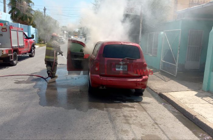 NUEVO LAREDO, TAM.- Un Chevrolet HHR modelo 2010 quedó parcialmente consumido por las llamas luego de que un cortocircuito en el área del motor provocara un incendio en calles de la colonia Centro.