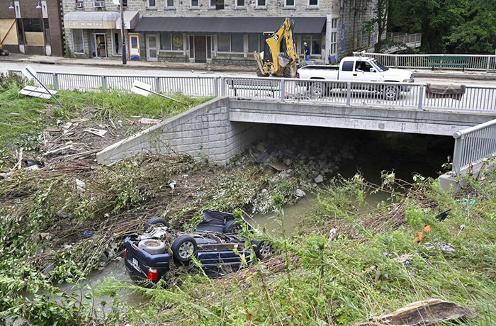 En una mañana nublada en el centro de Hindman, a unos 322 kilómetros (200 millas) al sureste de Louisville, un equipo limpiaba los escombros apilados en los escaparates. Cerca de allí, un vehículo se encontraba en el arroyo Troublesome Creek, que había vuelto a su cauce lleno de escombros.