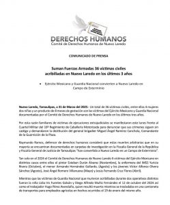Tan solo en el 2024 el Comité de Derechos Humanos de Nuevo Laredo 6 víctimas del Ejército Mexicano en distintos casos entre ellos el pintor Esteban Durán Álvarez (Noviembre), la enfermera del IMSS Yuricie Rivera (Octubre), el menor Armando Hernández Gallardo, (Agosto) y los jóvenes Víctor Alfonso Olvera Sánchez (Agosto), José Ángel Romero Villanueva (Mayo) y Jesús Fernando Cruz Flores (Abril).