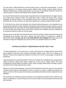 “Sigo esperando que la presidenta de México informe el resultado de la investigación que supuestamente ordenó al ejército”, expresó Lidia Galván, abuelita de la niña Lidia Iris Fuentes Galván. Ella estuvo acompañada de Brenda Melisa Fernández Carrillo, madre de Diego Alfredo Muñiz Fernández, quien al momento de morir estaba atado de pies y manos.