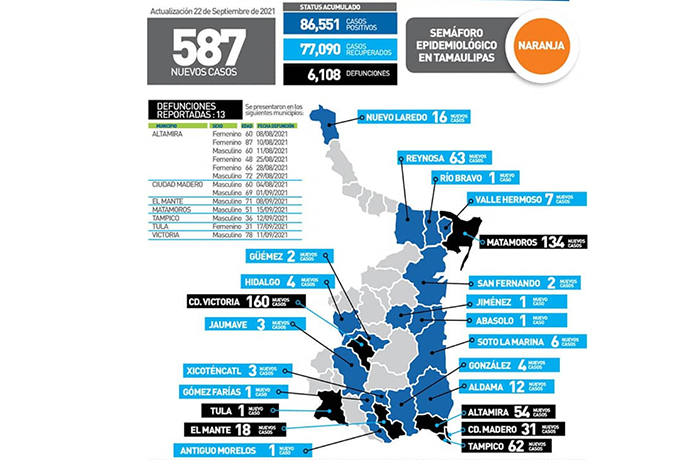 CIUDAD VICTORIA, TAM.- La pandemia del coronavirus en Tamaulipas sumó hoy 587 nuevos casos y cobró 13 víctimas mortales por complicaciones graves, informó la secretaria de Salud, Gloria Molina Gamboa al asegurar que “aún podemos frenar la transmisión del virus y mitigar su impacto si todos atendemos las medidas de seguridad sanitaria ya conocidas”.