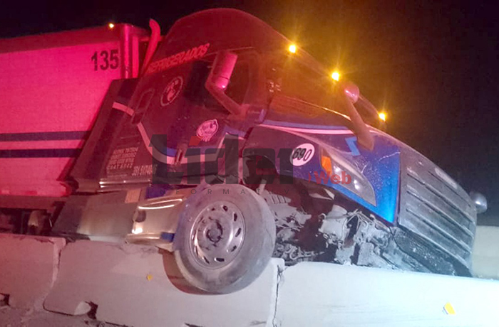 A unos 200 metros de la caseta de peaje, el tráiler se estrelló de manera violenta contra un muro de concreto de contención, provocando que la cabina quedara prácticamente sobre la estructura y dejando cuantiosos daños materiales.