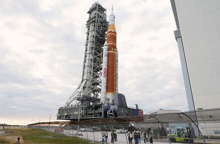 Con un peso de cinco millones de kilogramos (11 millones de libras), el cohete del Sistema de Lanzamiento Espacial (SLS, por sus siglas en inglés) y la cápsula de la tripulación Orion en la parte superior se trasladaron a bordo de un enorme transportador que se utilizó durante las eras Apolo y del transbordador. Fue mejorado para soportar el peso adicional del cohete del SLS.
