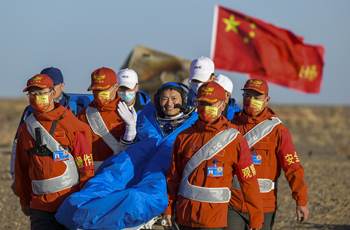 Jing Haipeng, Zhu Yangzhu y Gui Haichao salieron de la cápsula de retorno por la mañana cerca del Centro de Lanzamiento de Satélites de Jiuquan, en la periferia del desierto de Gobi, informó la agencia oficial de noticias Xinhua.