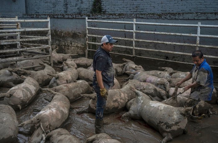 Arturo Huidobro, en el centro, y un trabajador se preparan para retirar cerdos muertos de una granja el sábado 11 de octubre de 2025 tras las fuertes lluvias caídas en Poza Rica, estado de Veracruz, México. (AP Foto/Félix Márquez)