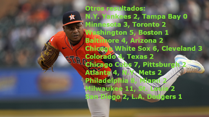 Por los Astros, el venezolano Altuve de 4-1 con una anotada. El cubano Yordan Álvarez de 4-2 con una anotada y una empujada. Los dominicanos Peña de 4-2 con una remolcada, Yannier Díaz de 3-0 con una impulsada. El puertorriqueño Víctor Caratini de 3-1.