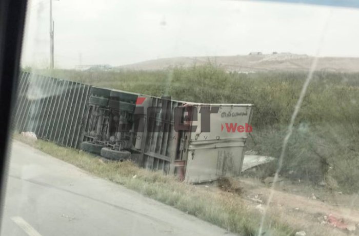 NUEVO LAREDO, TAM.- Un tracto camión con caja tráiler, cargado con mercancía de importación, volcó la tarde de este lunes en la carretera a Piedras Negras, a la altura del retorno hacia el basurero municipal. El incidente generó la movilización de las autoridades viales para atender la situación y evitar mayores afectaciones al tránsito.