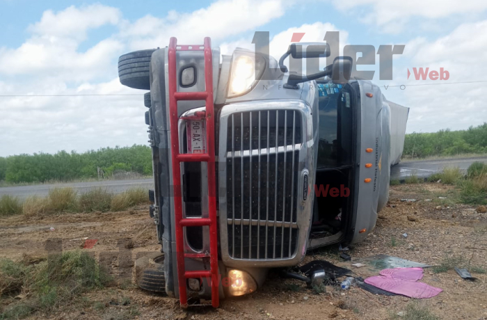 NUEVO LAREDO, TAM.- Con probable fractura de húmero y lesiones en diferentes partes del cuerpo resultó una trailera cuando la pesada unidad que conducía se volcó en la Carretera Nacional.